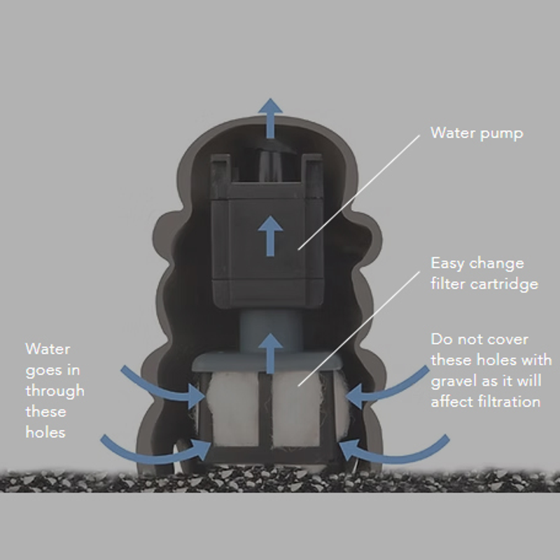 Filtration is powered by a USB water pump with up to 200L/hr combined with a small-size easy change cartridge (contains filter wool & activated carbon).