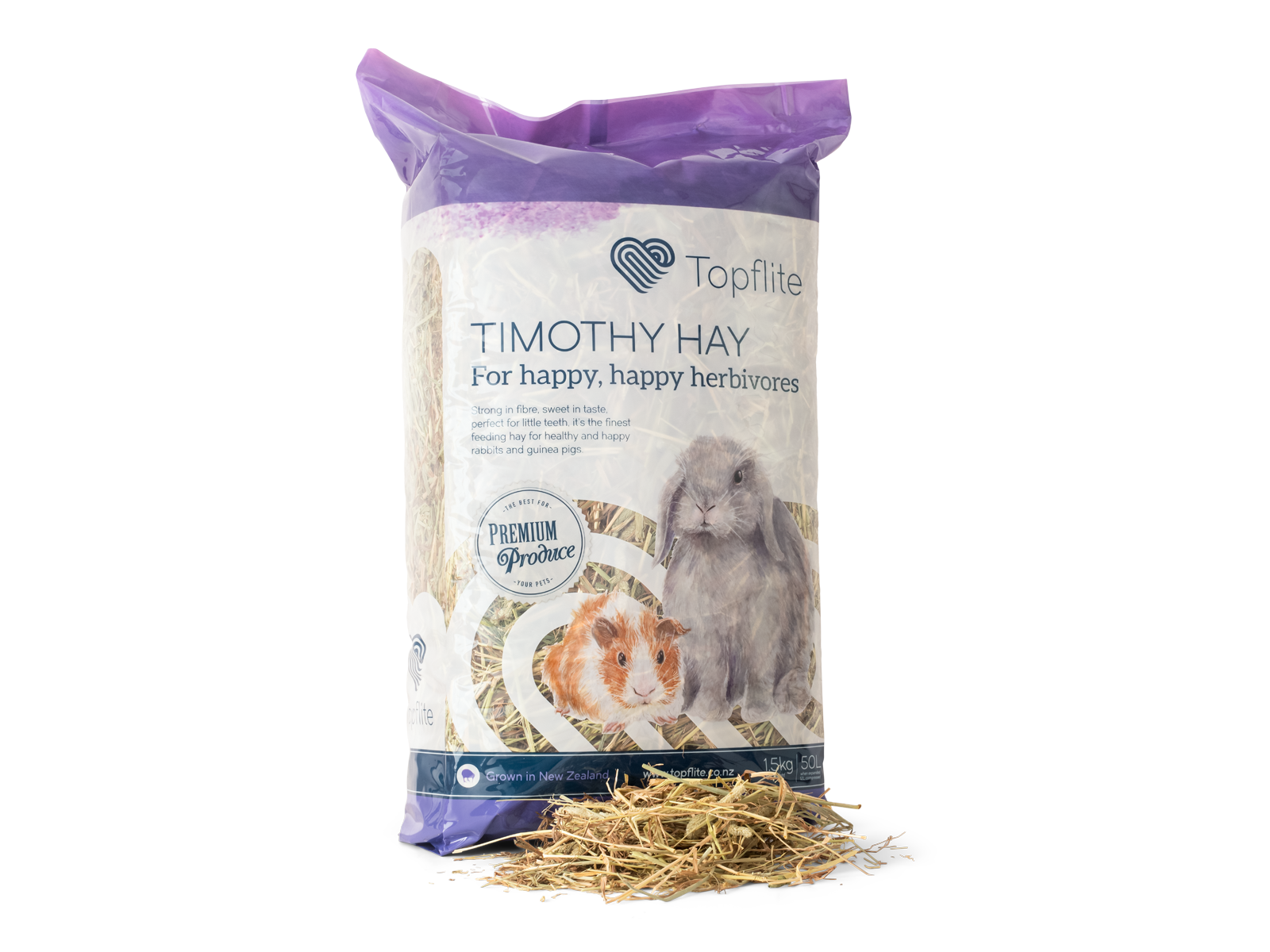 Our large-in-size, good-in-value, great-in-nutrition Timothy Hay is carefully grown in New Zealand's south before being tested and packed to ensure the very best result for your rabbits, guinea pigs, and other happy herbivores.
